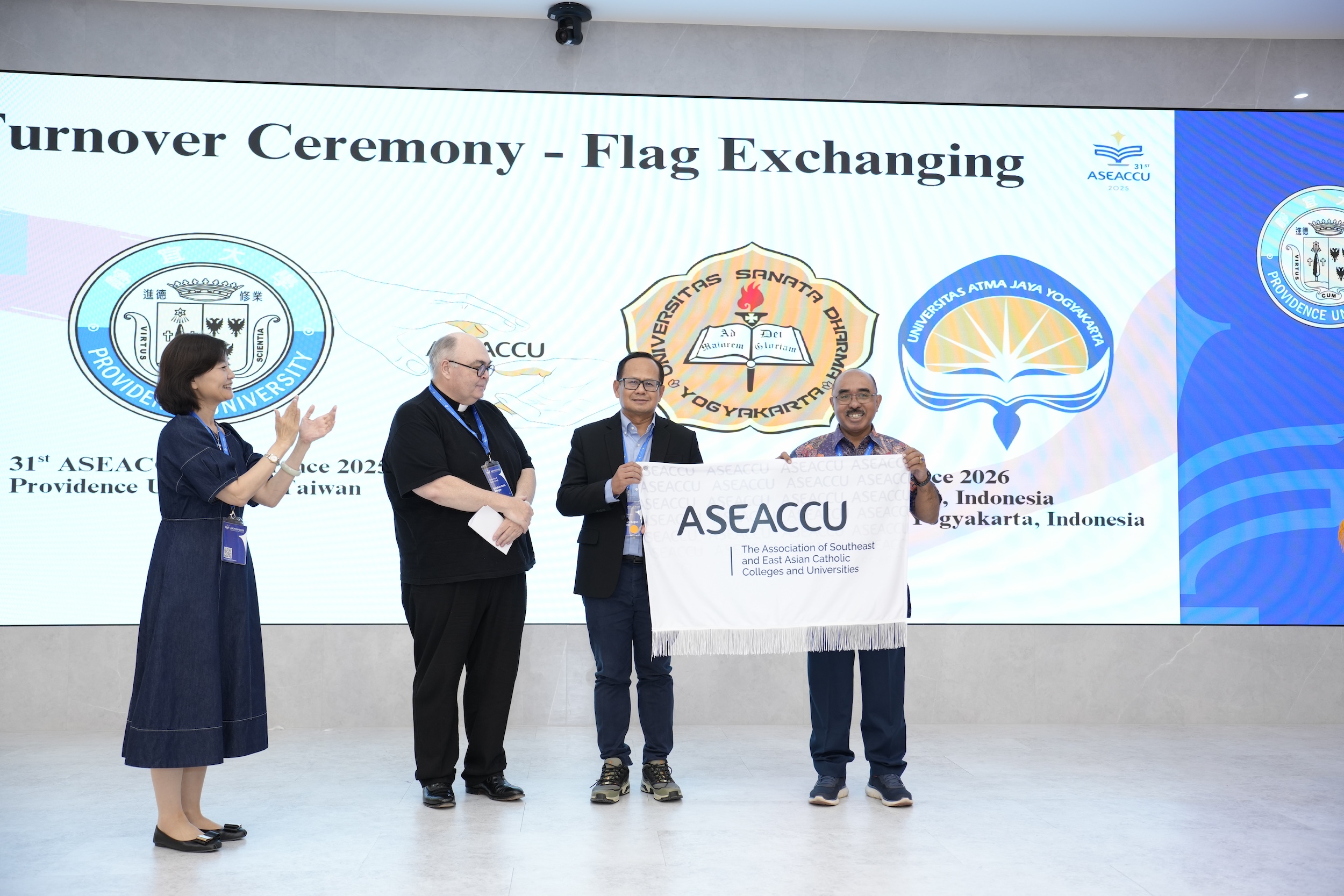 [Dr. Lucia Shih-Ling Lin, President of Providence University, Taiwan, representing the current host institution, passes the ASEACCU flag to fr. Albertus B. Laksana, Rector of Sanata Dharma University, and Dr. G. Sri Nurhartanto, Rector of Atma Jaya Yogyakarta University, the next co-hosts of the ASEACCU Annual Conference, witnessed by ASEACCU Executive Secretary Rev. Prof. Stephen Morgan]
